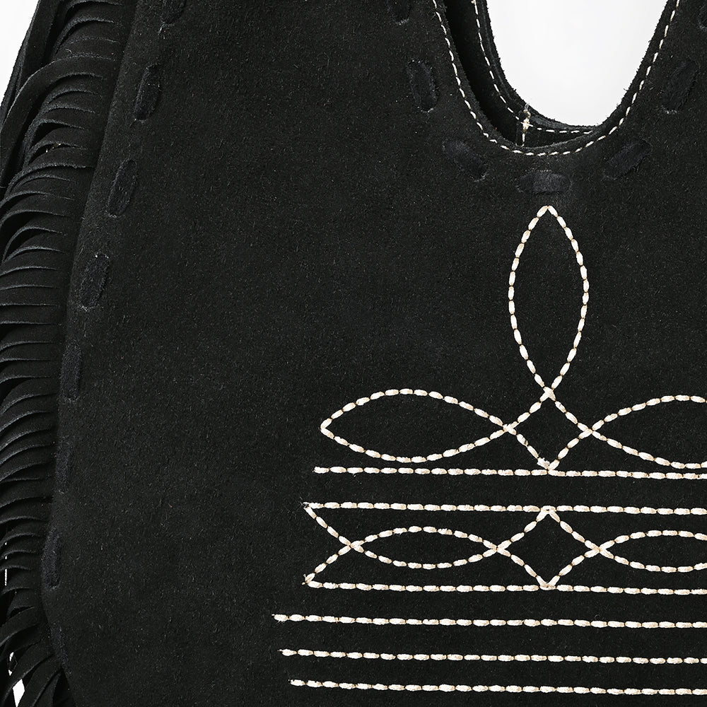 Its gently rounded V-shape, spacious interior, and bold fringe finish give it a rustic yet refined cowgirl charm.