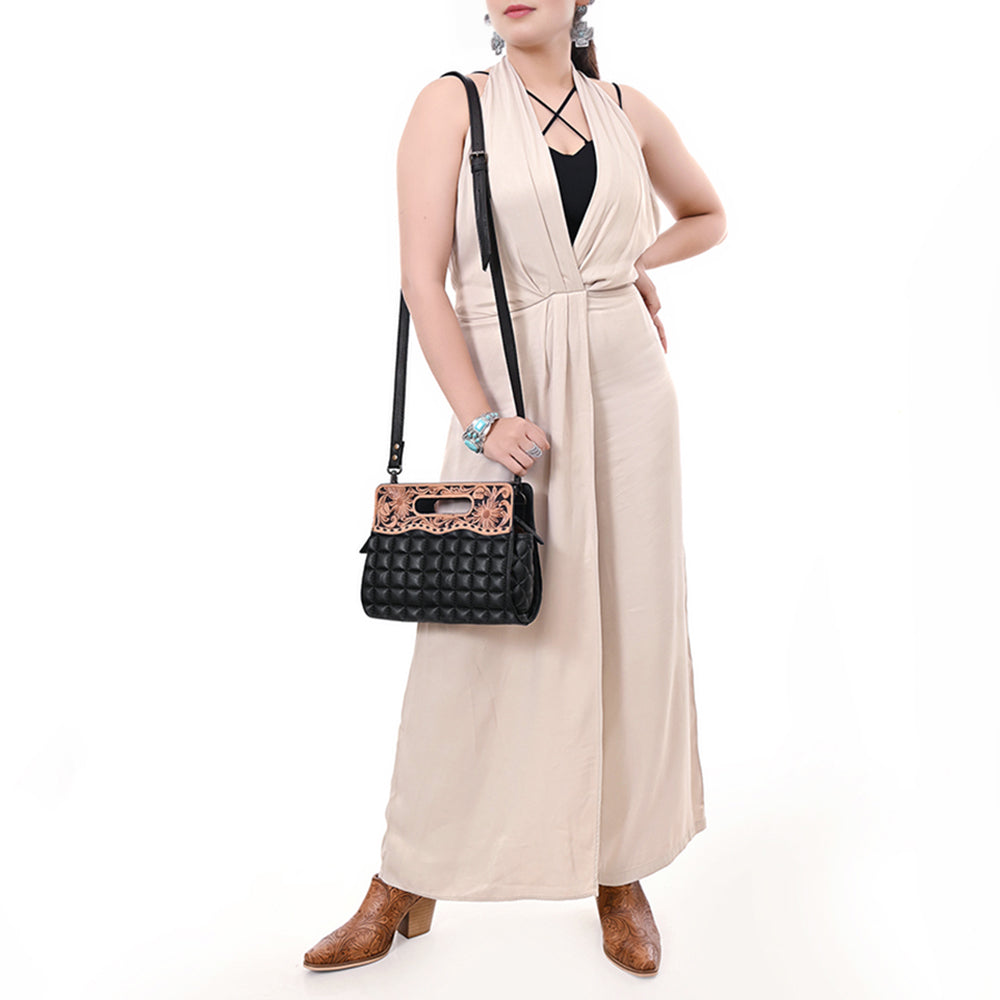 Turn heads with this striking Western handbag from American Darling, combining classic quilted leather with artisan tooling. The sleek black body features soft, diamond-stitched leather, beautifully contrasted by a hand-tooled floral leather top panel with an integrated cut-out handle.