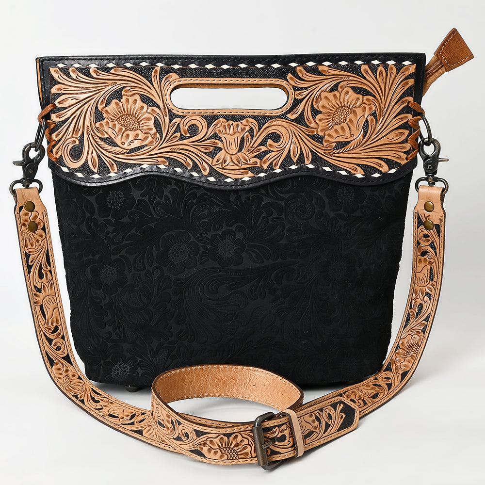 This Western tote blends elegance with heritage in every stitch. Featuring a black floral-embossed leather body and a top panel carved with intricate hand-tooled floral scrolls in natural tan leather, this bag is a masterpiece of craftsmanship. The built-in handle adds versatility, while the detachable, tooled leather strap allows for comfortable clutch or shoulder carry.