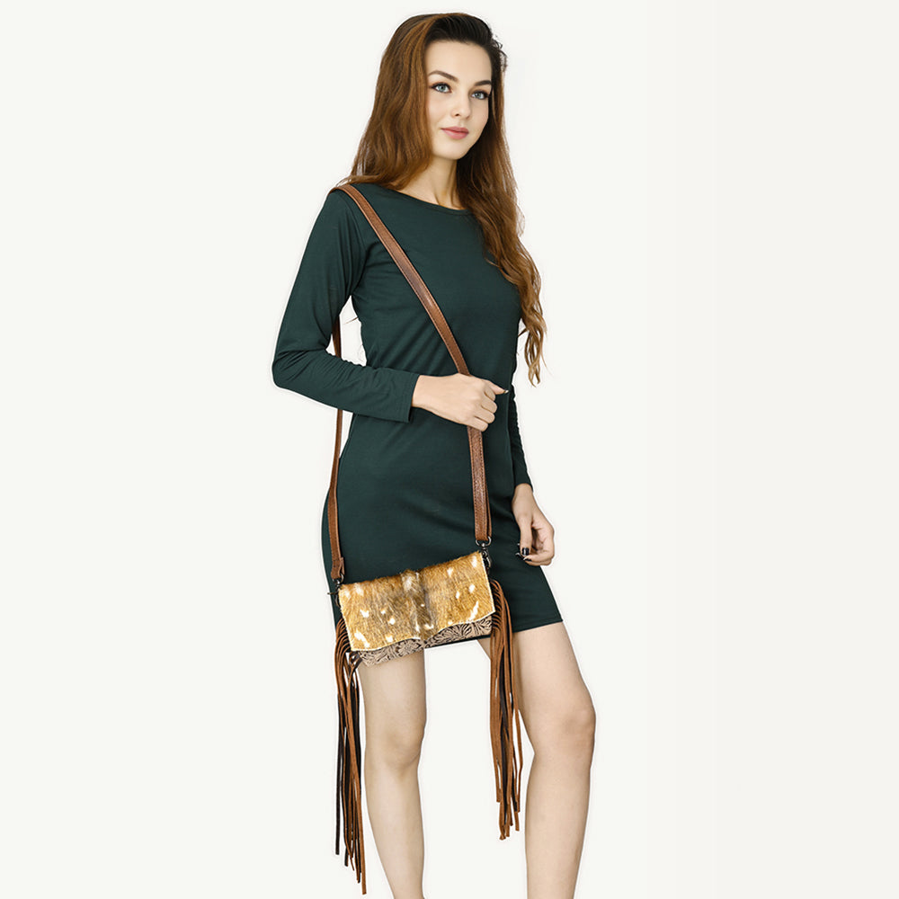 Turn heads with this bold and beautiful Axis hide sling bag, crafted from genuine leather and finished with long flowing fringe. The unique natural pattern of the deer hide flap is paired with a handtooled leather base, creating a one-of-a-kind statement piece. Lightweight, hands-free, and designed for style-forward Western lovers.