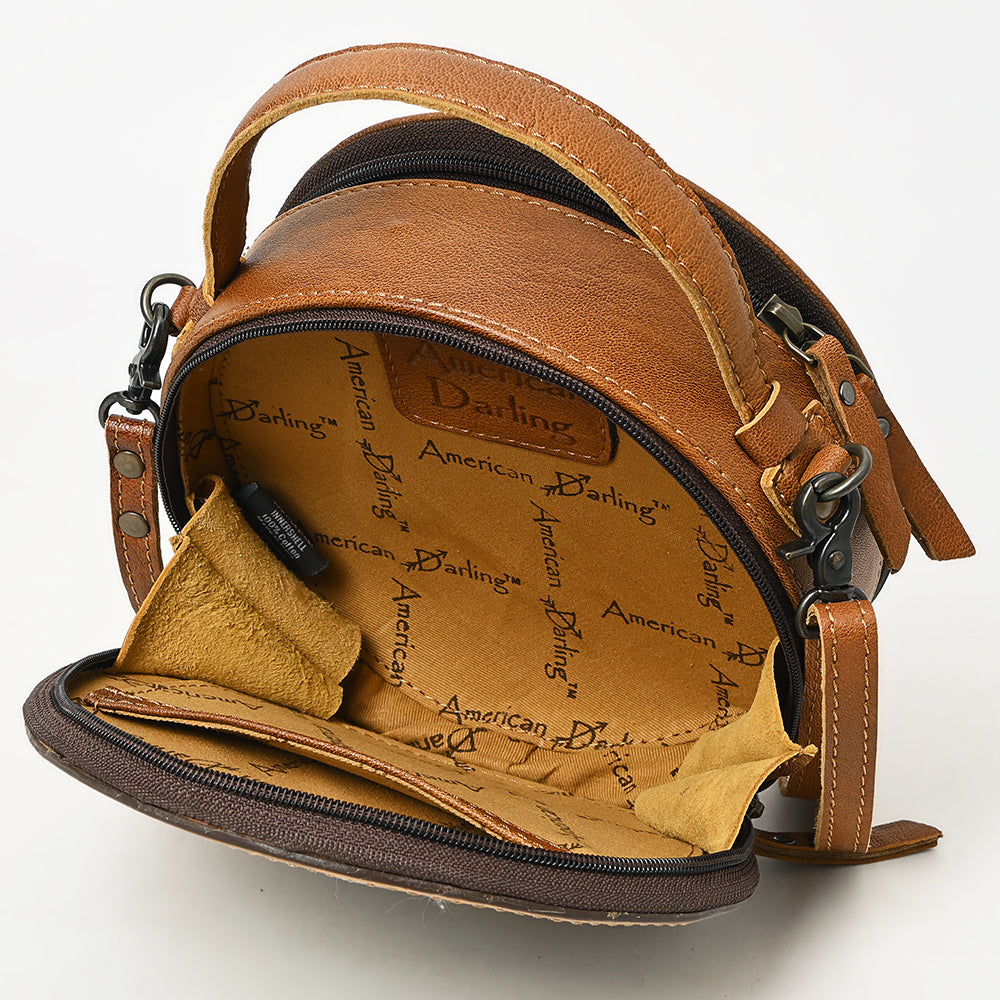 ADBG1458 Round Cowhide & Tooled Leather Bag - Western Crossbody with Turquoise Mosaic Inlay