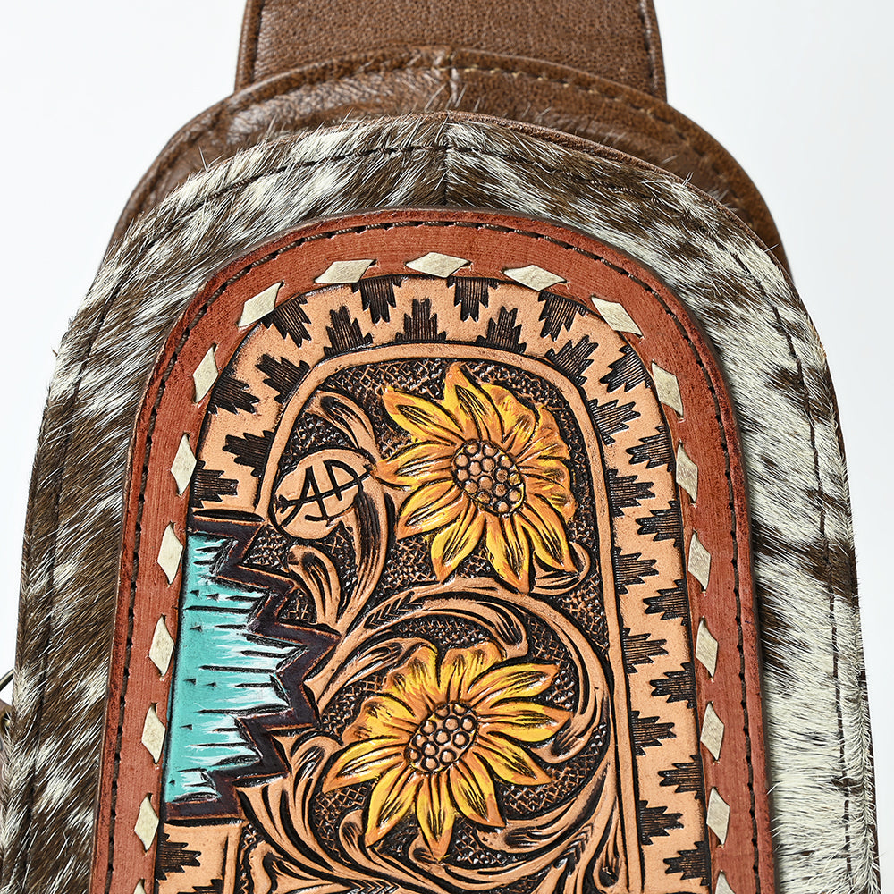 Brighten your Western wardrobe with this handcrafted cowhide sling backpack, showcasing an exquisite hand-tooled sunflower design on a warm tan leather panel. Surrounded by whipstitch detail and framed with natural Cowhide, this bag is a stunning blend of artistry and rugged charm.