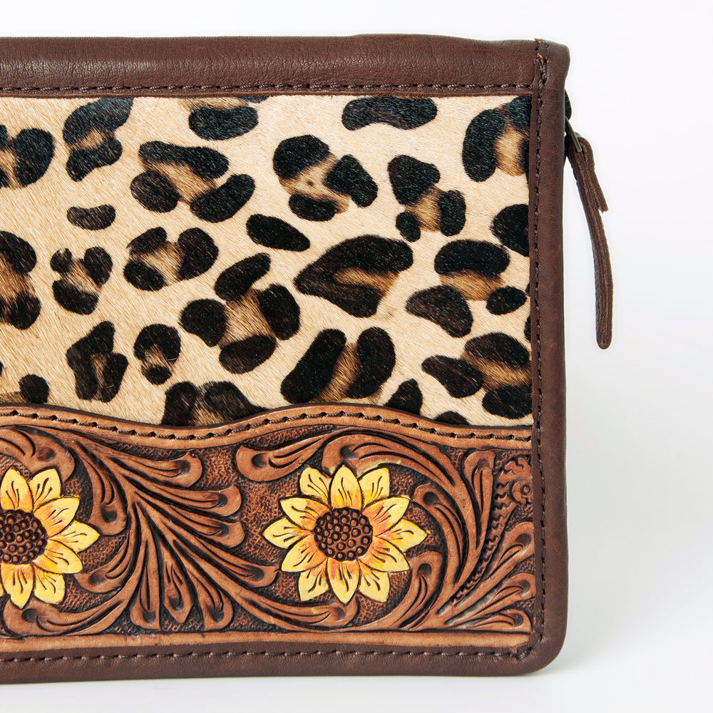 Elevate your everyday essentials with this stunning zip wallet, crafted from genuine hair-on cowhide and detailed with hand-tooled floral leather. The vertical design features a natural cowhide panel complemented by a sculpted leather floral edge, combining rustic charm with refined Western craftsmanship.