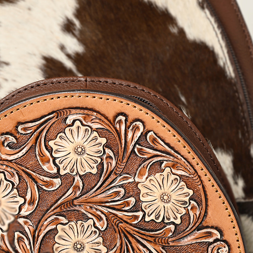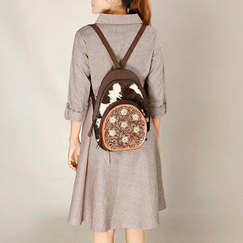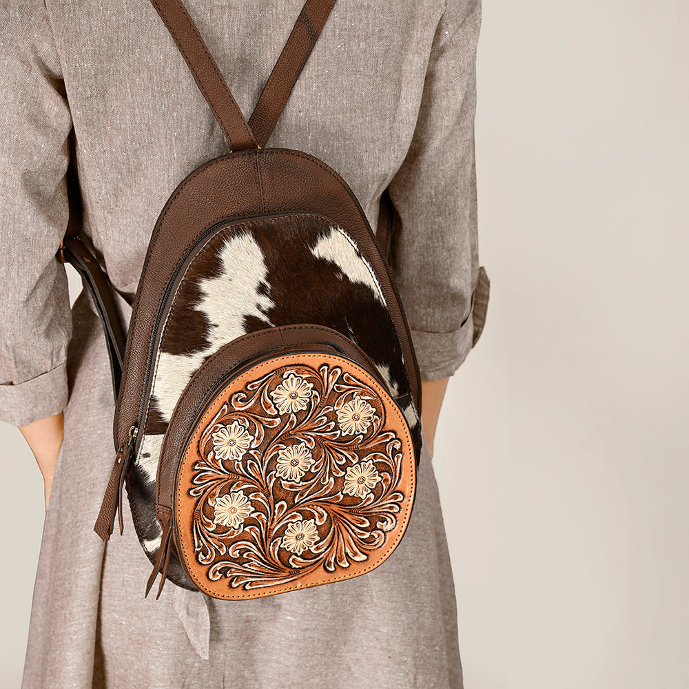 Elevate your Western style with this handcrafted American Darling backpack made from premium black and white cowhide and genuine leather. The front features an intricate hand-tooled floral leather design, perfect for adding rustic elegance to your everyday look.