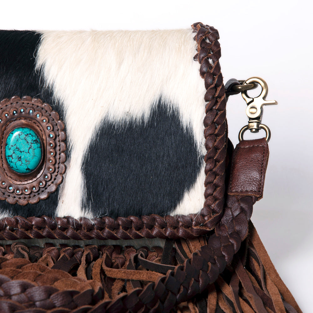 Make a bold Western statement with this handcrafted cowhide leather Wallet bag. Featuring genuine hair-on-hide in a classic black-and-white pattern, this showstopper is trimmed in rich chocolate leather and finished with braided accents and swaying fringe.
