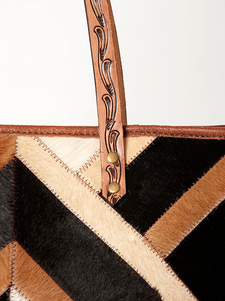 Elevate your western style with this handcrafted tote bag, featuring a stunning geometric patchwork design made from natural cowhide in shades of black, white, and brown. The body is structured yet soft, offering a blend of durability and luxury. The genuine leather shoulder straps showcase intricate hand-tooled detailing, while the detachable crossbody strap adds versatile styling options. A zippered top closure secures your essentials, making it both stylish and practical for everyday wear.