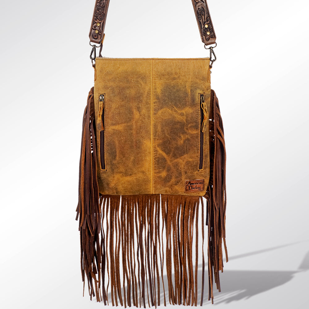 LC-ADBGS192 Cowhide Messenger Bag with Tooled Patch, Fringe & Floral Strap - Western Boho Purse