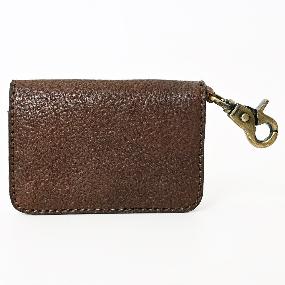 This compact keychain wallet combines classic Western craftsmanship with everyday convenience. Made from genuine leather, it features a hand-tooled sunflower pattern, a smooth brown leather top panel, and an antique brass snap hook for secure attachment to belts, bags, or keyrings.