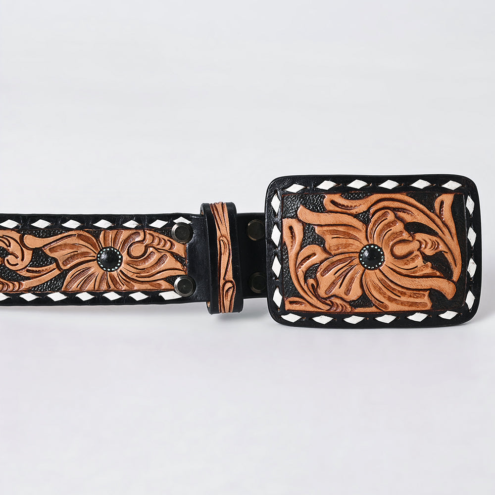 ADBLF279 Tooled Leather Western Belt - Black Inlay with Floral Design and White Edge