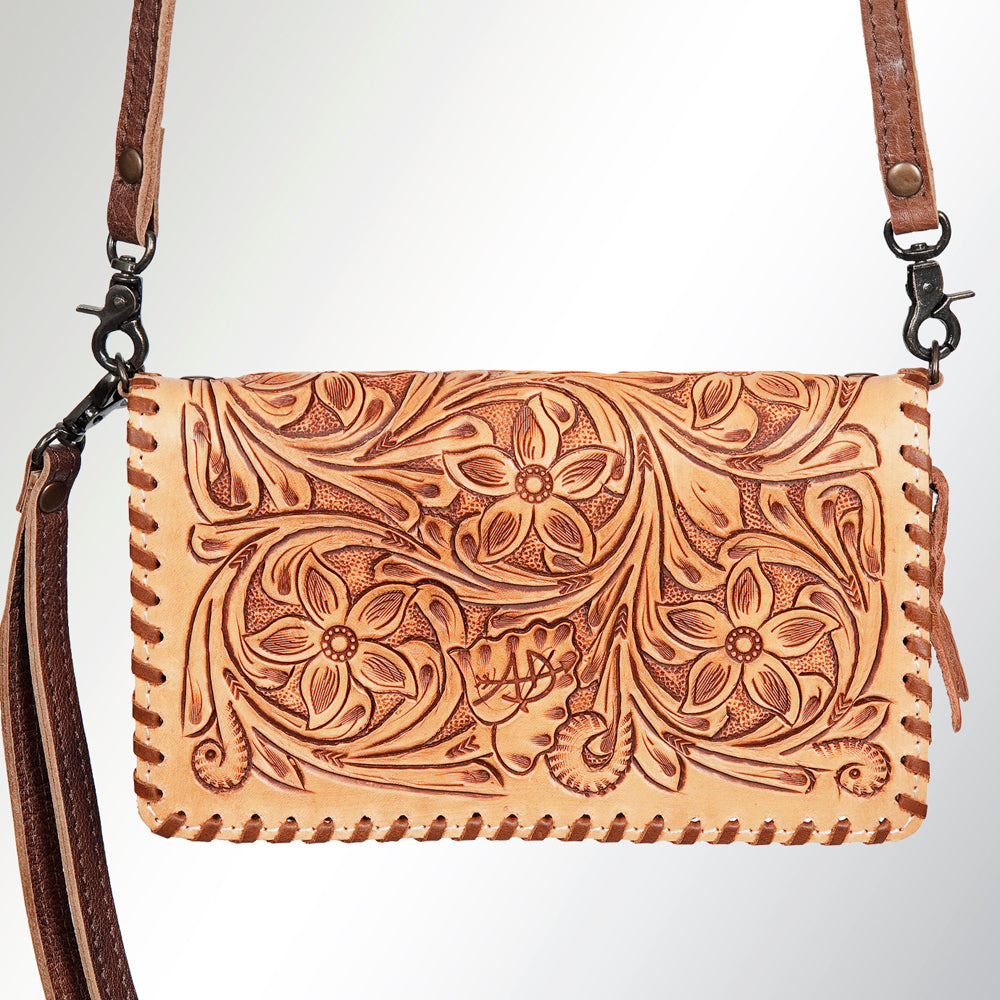 ADBG485 Western Floral Tooled Leather Organizer Bag Handmade Cowhide Wristlet by American Darling