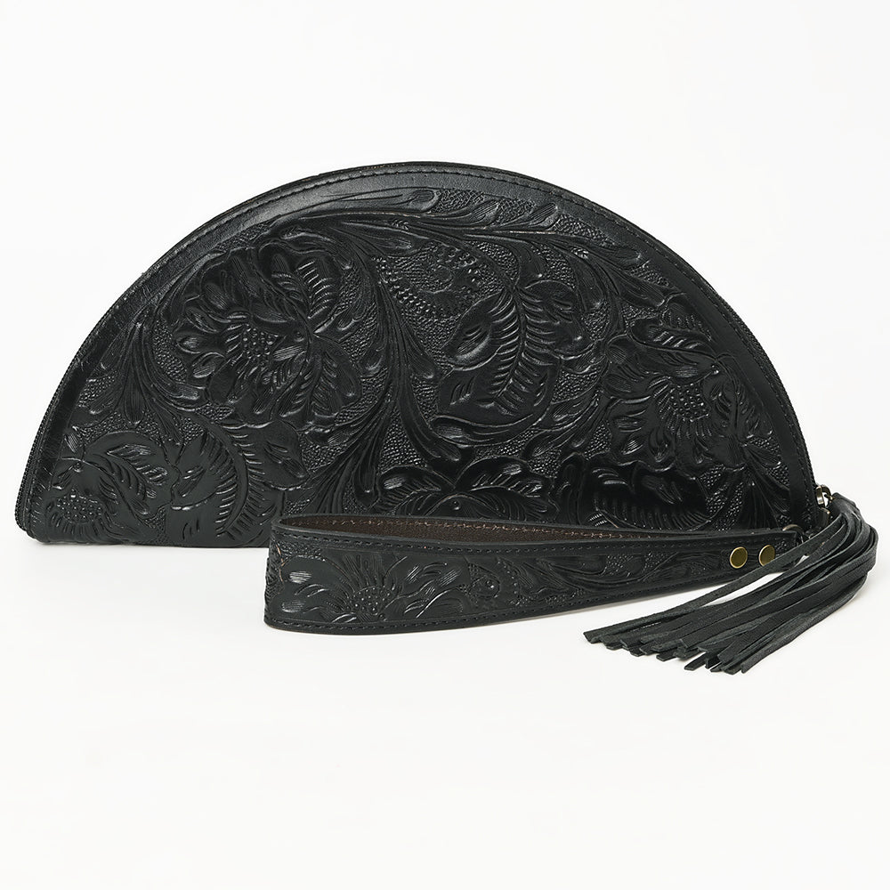 LC-ADBG1233E Black Hand-Tooled Leather Clutch - Semi-Circle Design with Wrist Strap