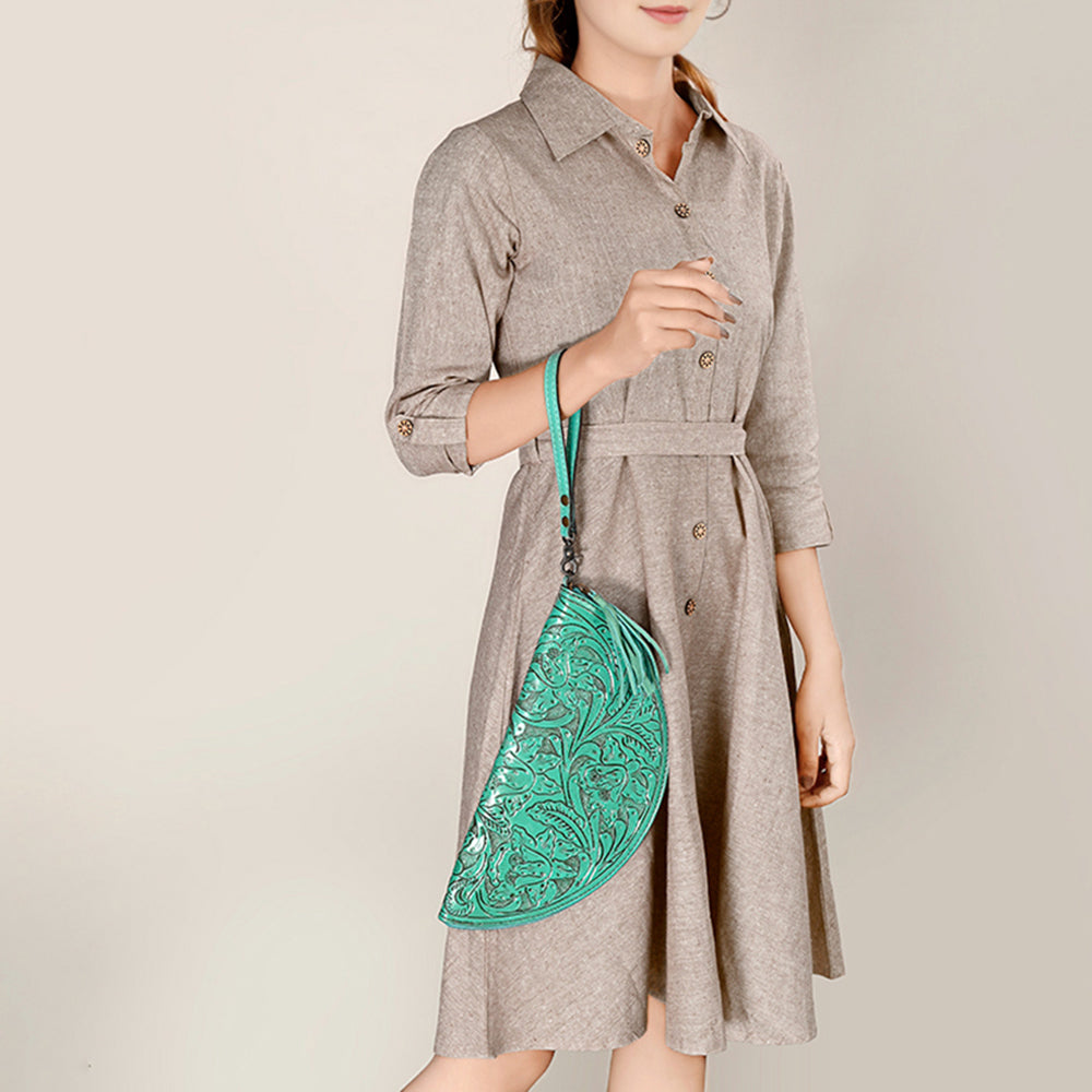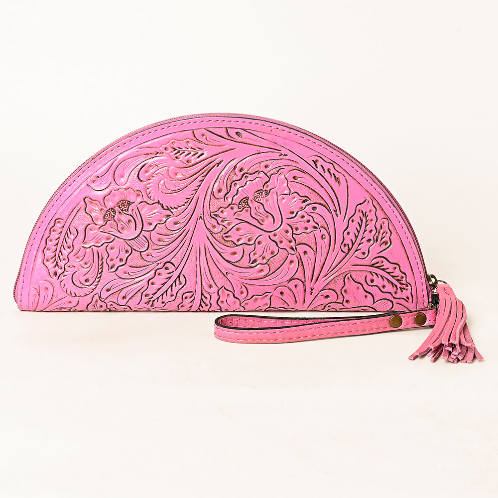 LC-ADBG1233H Hand-Tooled Leather Clutch - Semi-Circle Wristlet with Tassel
