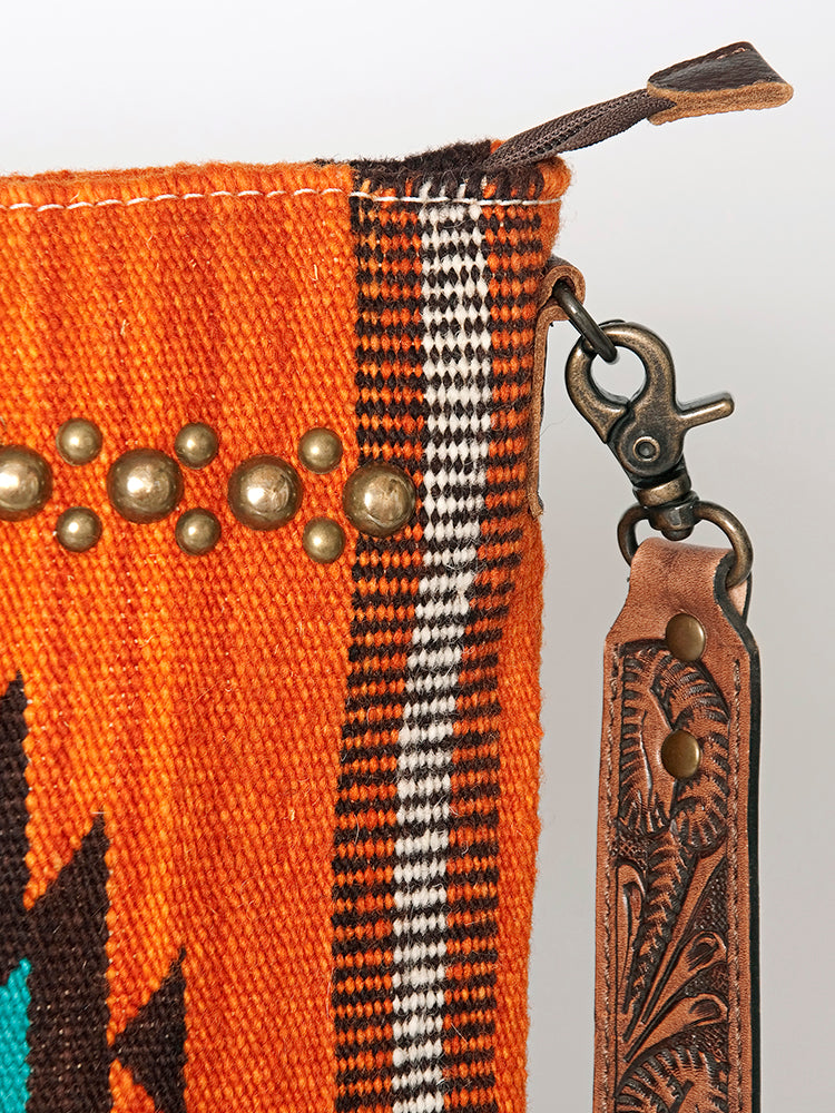 Infuse your look with vibrant Western style using this handcrafted crossbody bag. The bold orange wool saddle-blanket front features a central turquoise-and-black geometric motif, accented by an antiqued brass stud row. Genuine full-grain leather trim and a hand-tooled floral leather strap bring artisanal detail, while the zip-top closure and interior pocket keep your essentials secure.