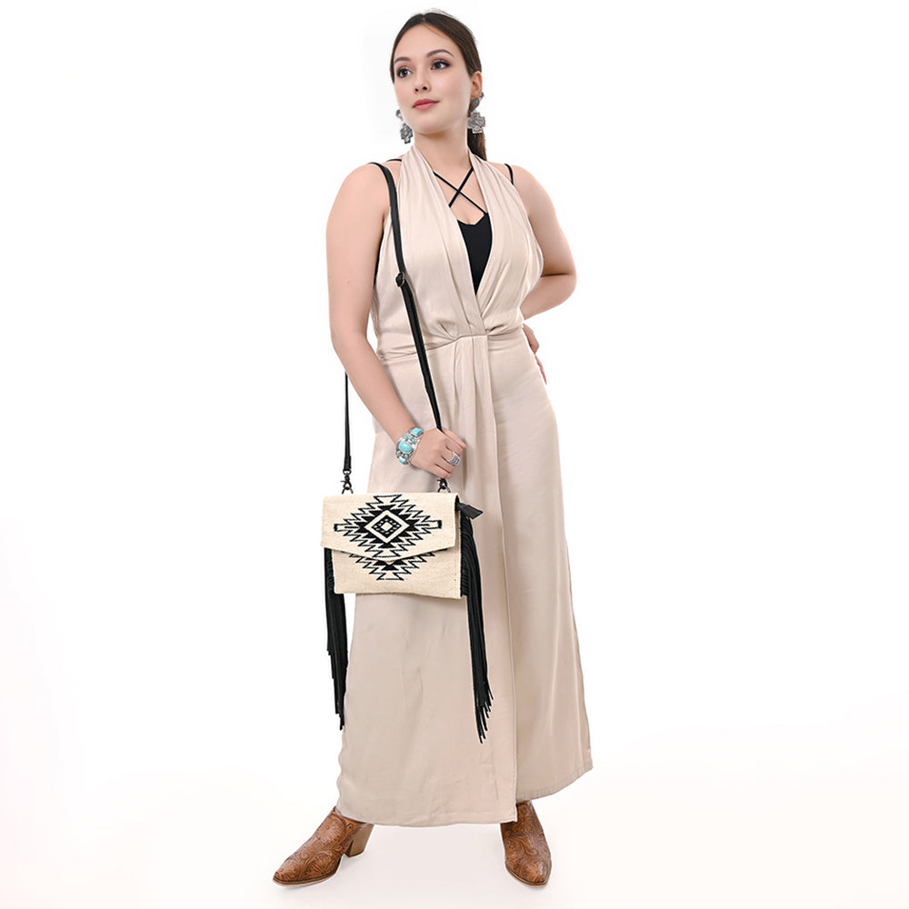 LC-ADBGS178BG Western Crossbody Envelope with Aztec Design and Fringe - Black & Ivory Wool Fabric