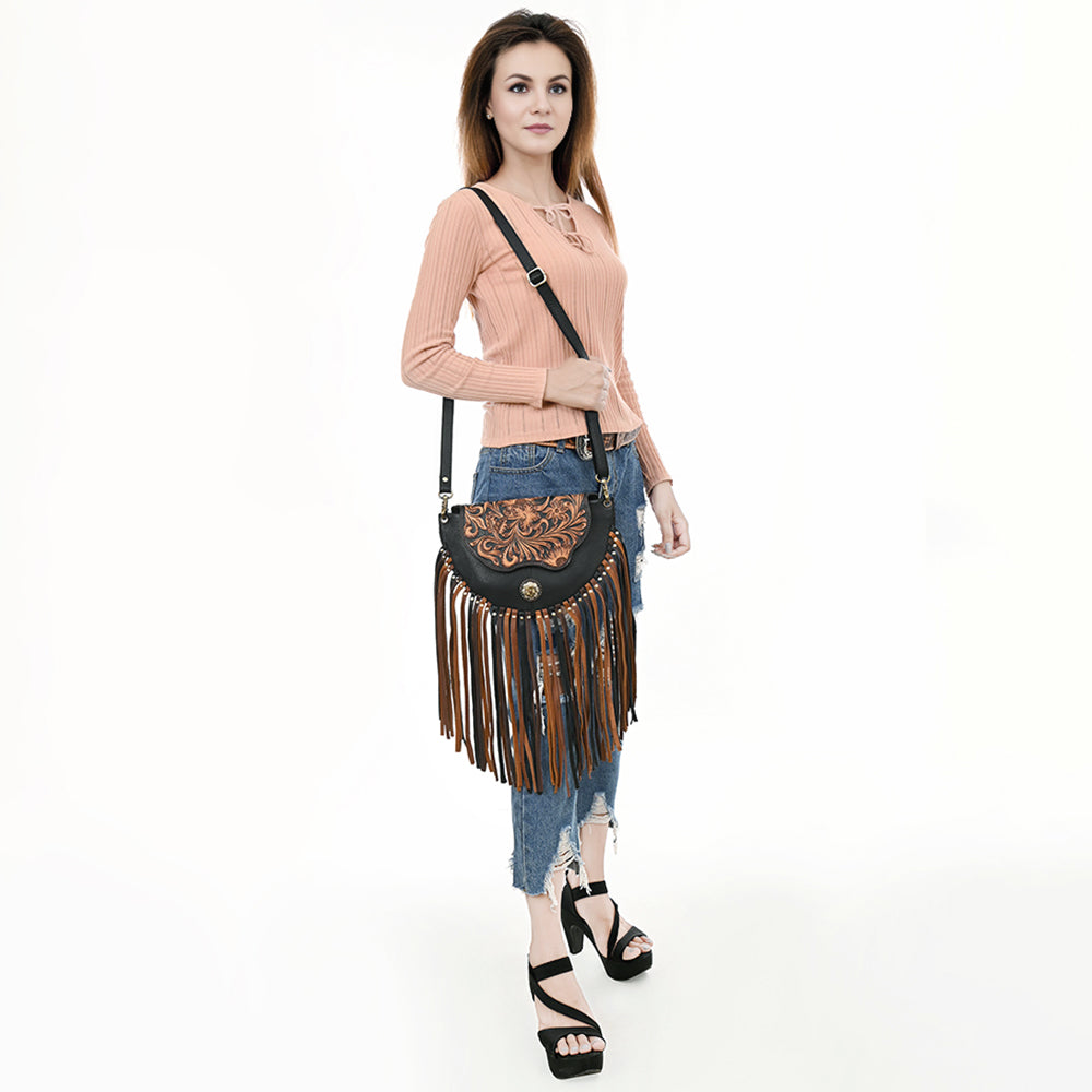 ADBGA540A American Darling Black Leather Tooled Crossbody Bag with Fringe & Concho