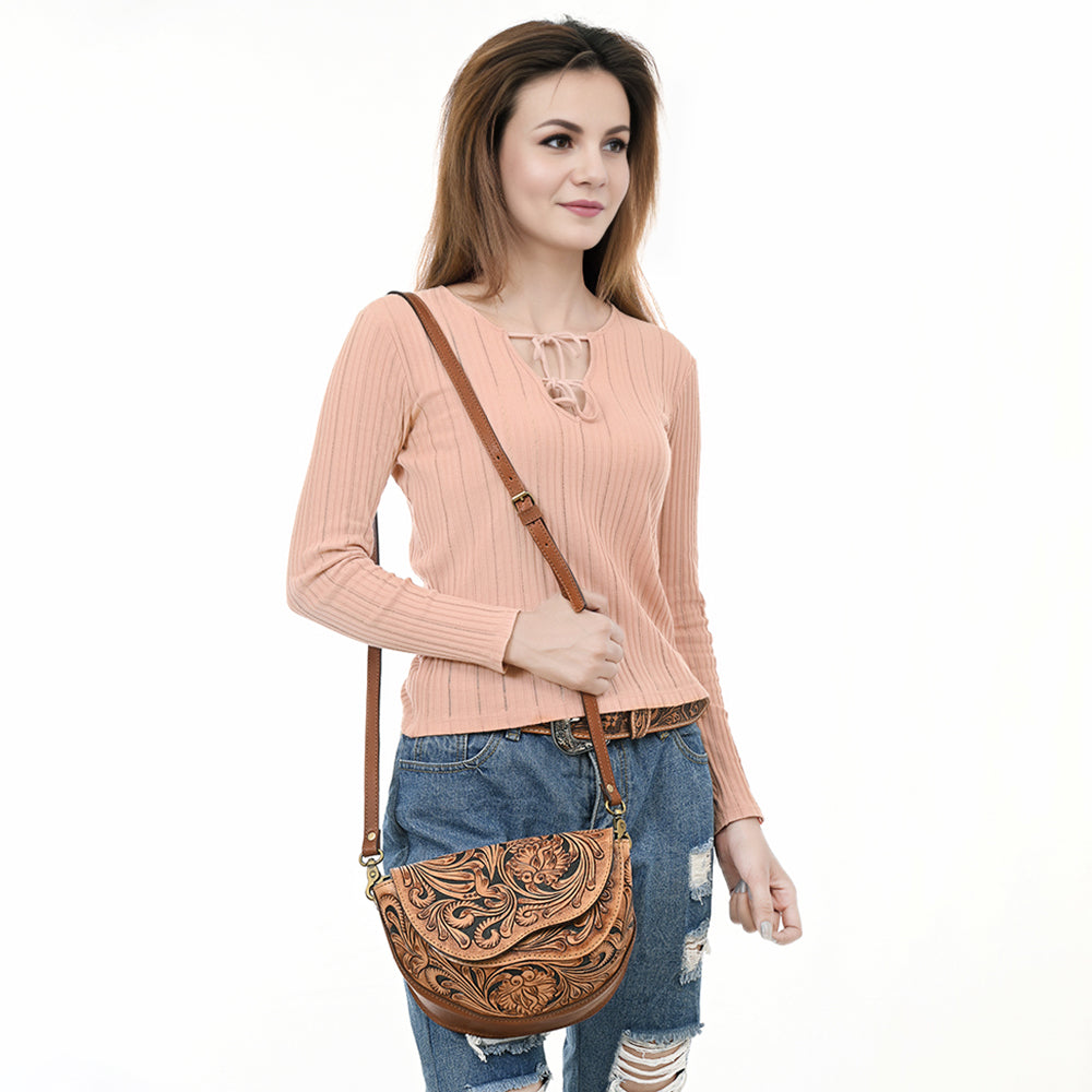 ADBGA561 Hand-Tooled Leather Crossbody Saddle Bag Western Floral Carved Purse