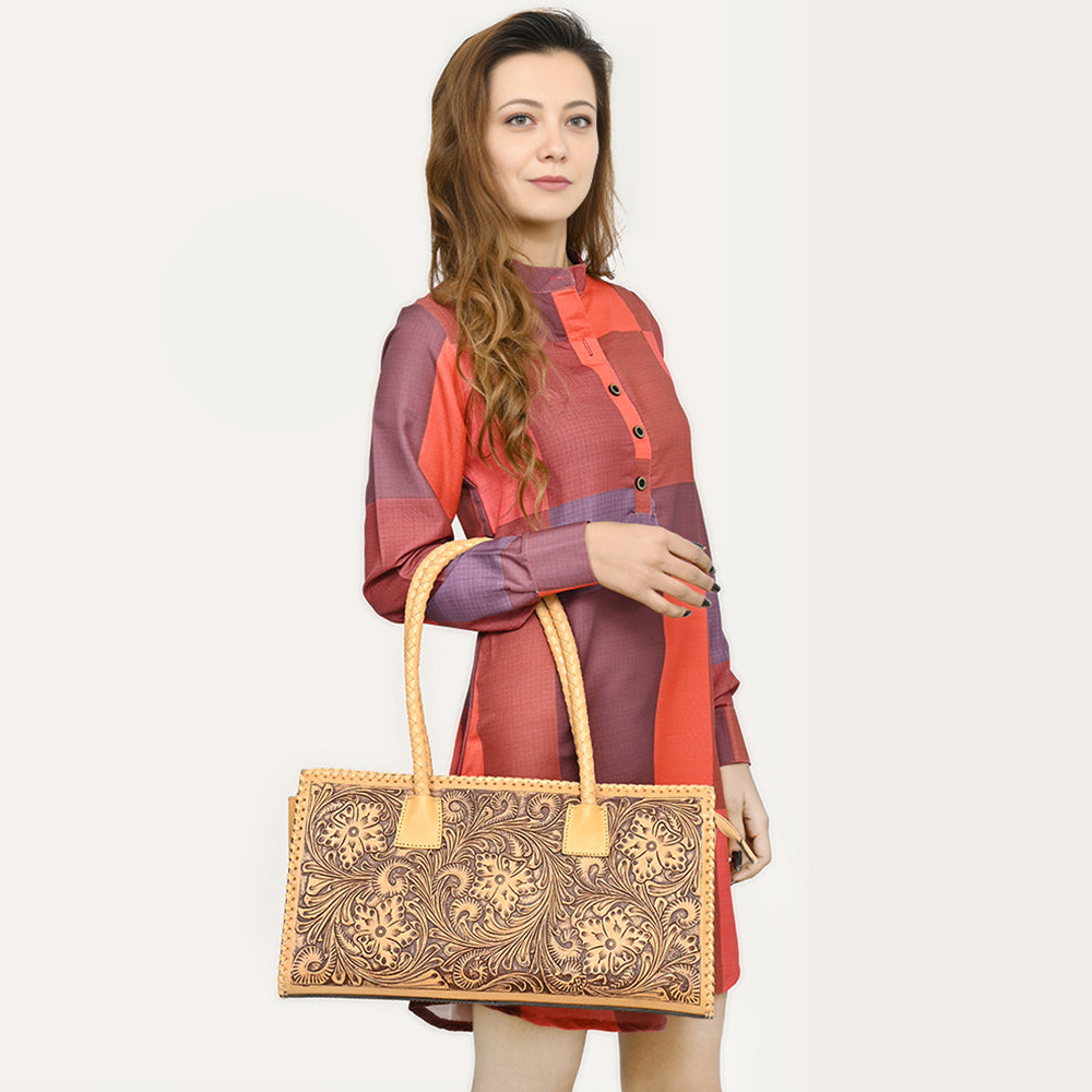 ADBGZ833 Hand-Tooled Leather Western Handbag - Floral Design with Braided Handles