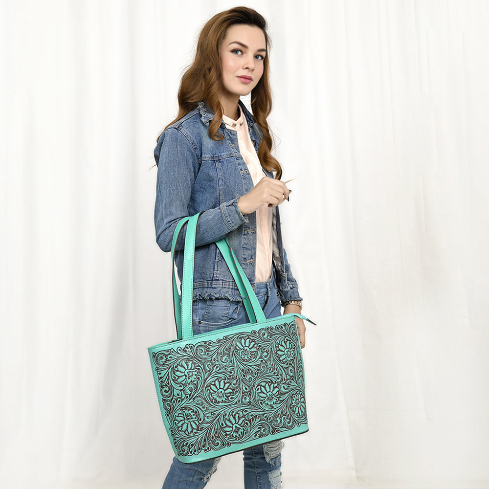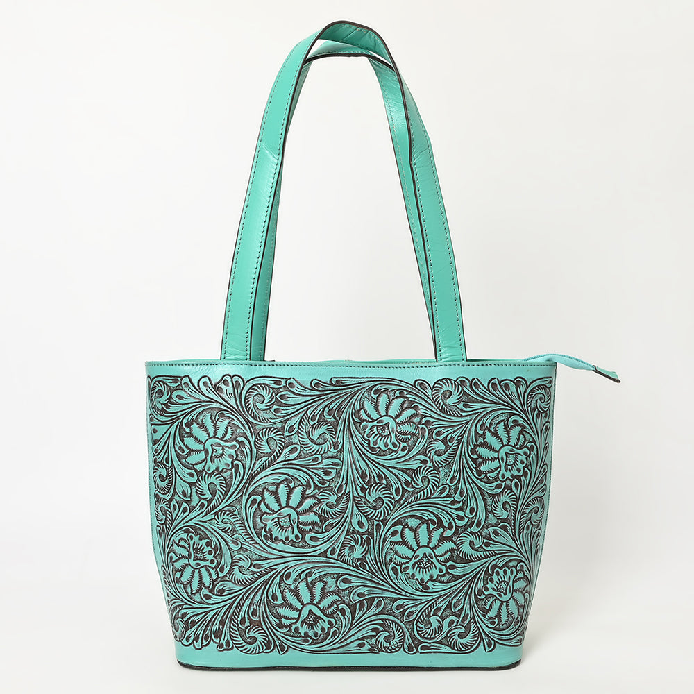 Elevate your Western look with this vibrant hand-tooled leather tote bag, a bold blend of tradition and modern luxury. Crafted from premium full-grain leather, the floral tooling offers intricate detail that celebrates Western artistry. The eye-catching turquoise hue adds a fresh, feminine twist to a classic silhouette.