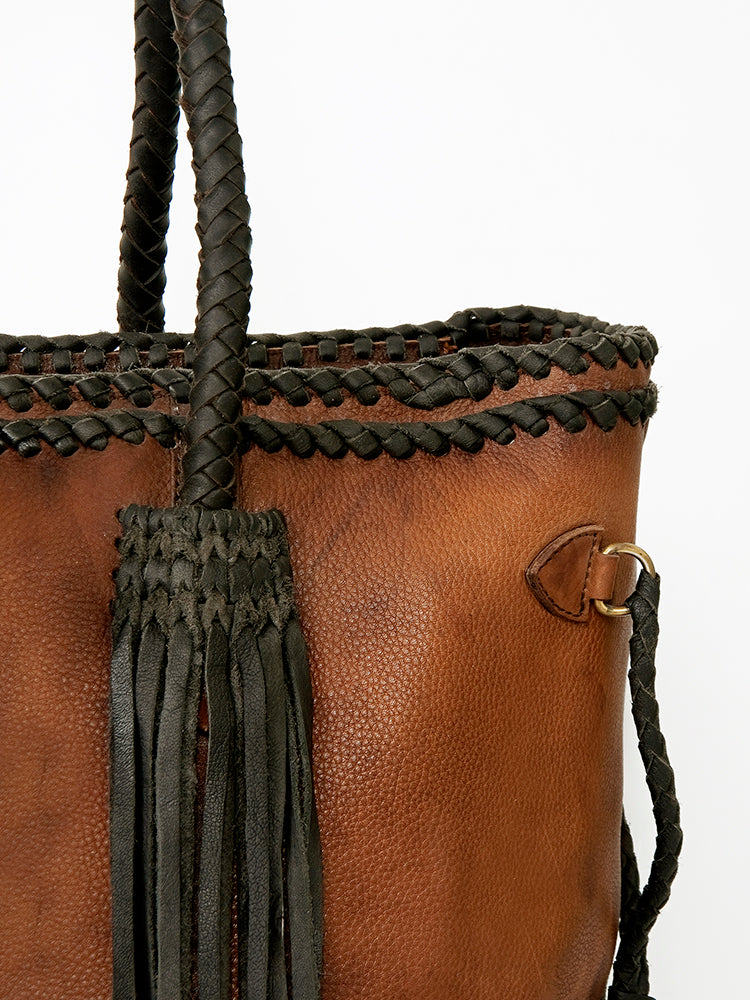 ADBGD132A Brown Leather Western Tote Bag with Braided Fringe & Handles - Handmade Boho Style