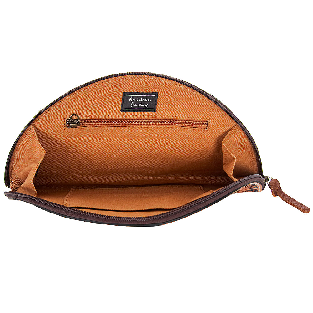 Celebrate Western elegance with this eye-catching Taco-Shaped Leather Wristlet by American Darling. Crafted in Texas, this semi-circle clutch merges traditional hand-tooled floral leatherwork with luxurious, handpicked hair-on cowhide for a truly authentic Western look.