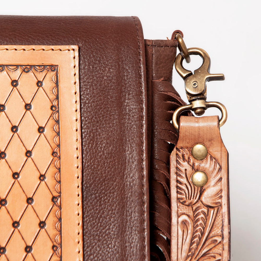 LC-ADBGA158 Sunflower Tooled Leather Crossbody Bag with Quilted Panel & Fringe Brown Western Shoulder Purse