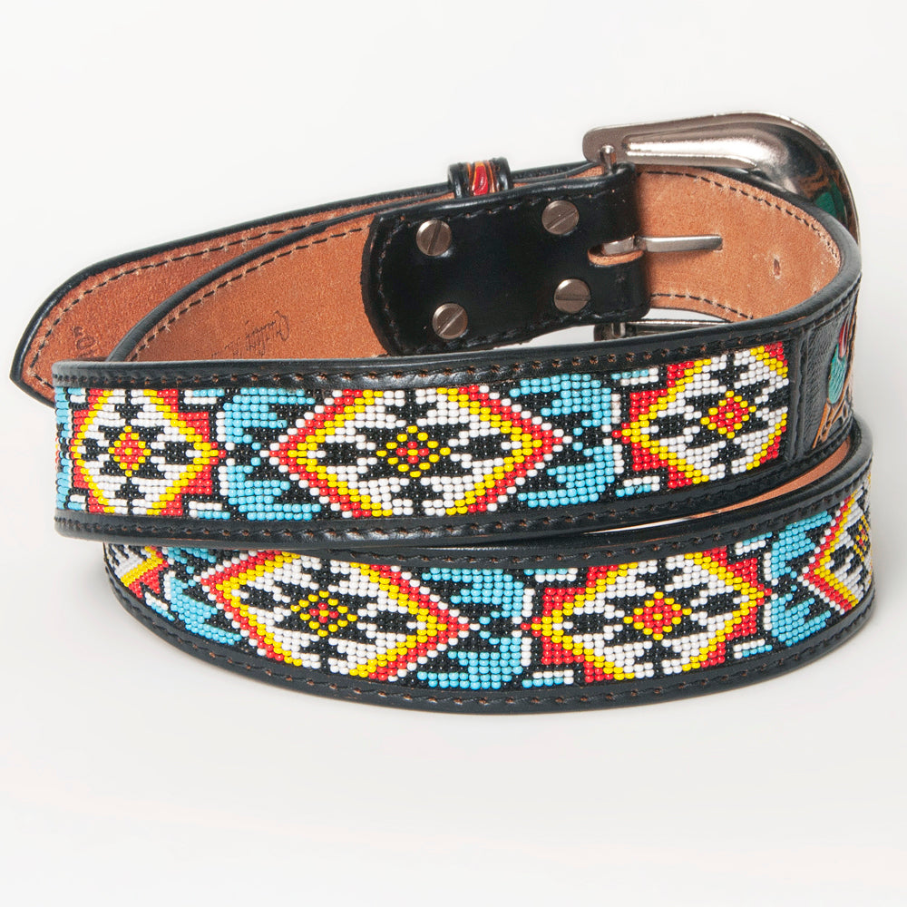Make a bold Western statement with this handcrafted leather belt featuring vibrant beadwork and exquisite tooling. A colorful diamond-shaped geometric bead pattern runs through the center, perfectly contrasted with hand-tooled golden feather accents on rich black leather.