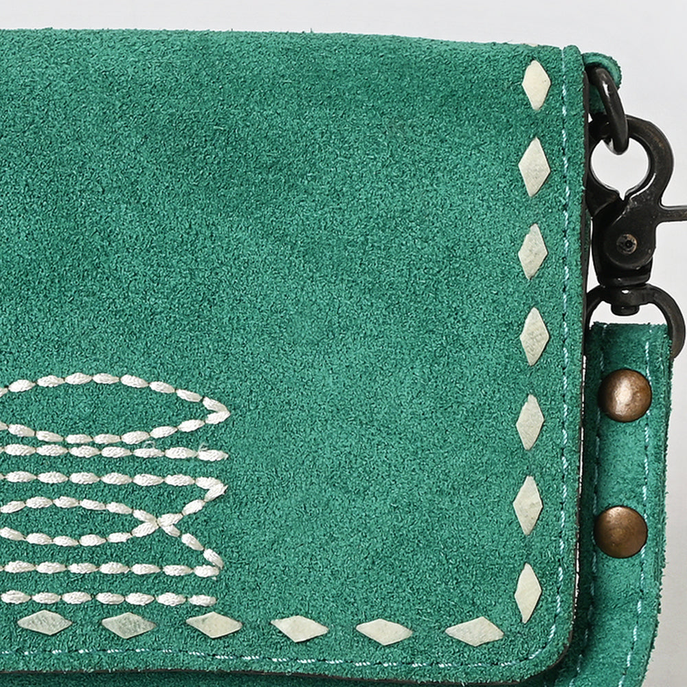This compact genuine leather Wallet bag features classic Western charm with white whipstitch detailing and a rustic hand-sewn motif on the flap. Made from soft, durable suede-finish leather, it's the perfect lightweight accessory for everyday use. The adjustable leather strap offers comfortable hands-free wear, while the flap closure keeps your essentials secure. A blend of function and frontier-inspired style, perfect for rodeos, markets, and casual outings.