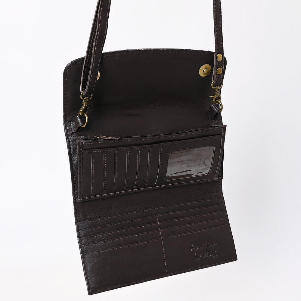 Add timeless Western flair to your essentials with this handcrafted leather wallet by American Darling. Featuring exquisite hand-tooled floral patterns in cream and tan tones, this wallet doubles as a wristlet or mini crossbody with a removable strap. A perfect blend of function and fashion for Western lifestyle lovers.
