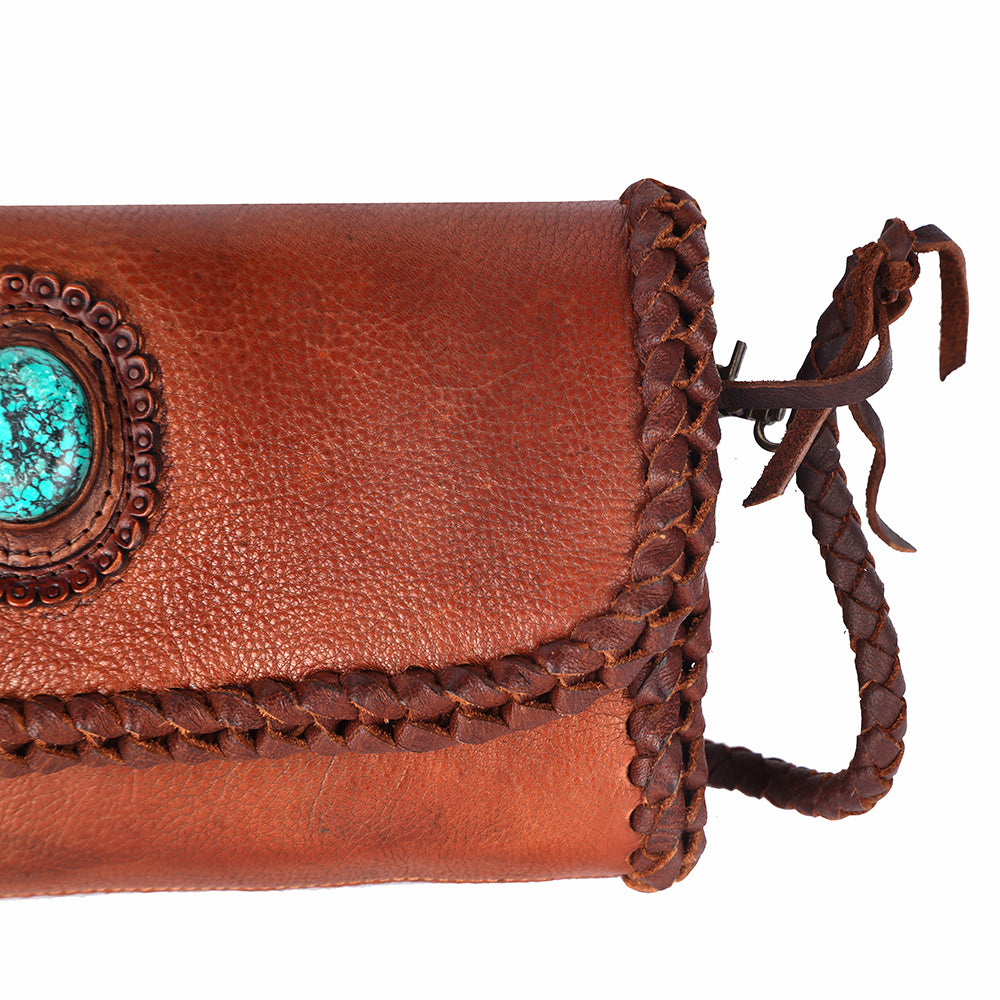 Small in size but big in Western style, this Mini Leather Wallet Bag is the perfect grab-and-go piece for cowgirls on the move. Handcrafted from rugged full-grain leather, it features a compact silhouette with beautifully braided edges and a bold turquoise concho centerpiece. The braided strap is both stylish and functional, ideal for concerts, rodeos, and daily carry.