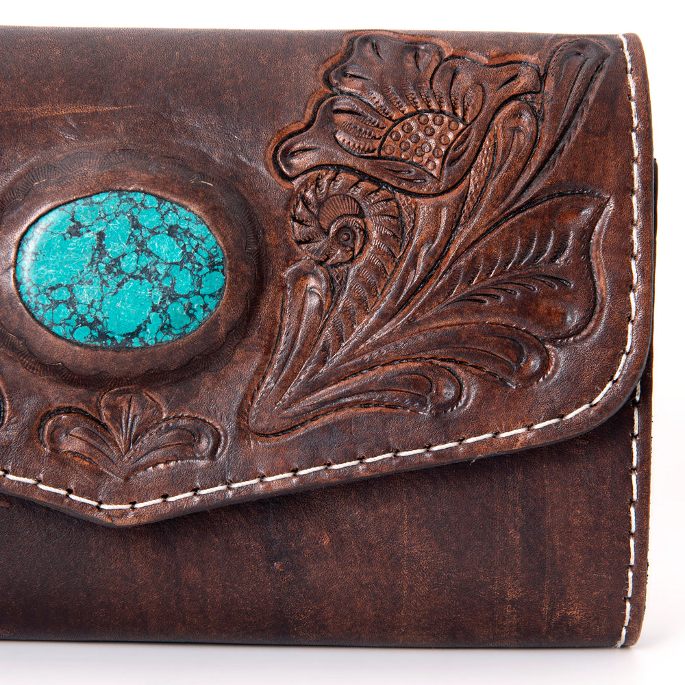 LC-ADBGH105A Tooled Leather Western Wallet - Turquoise Stone Inlay & Floral Design