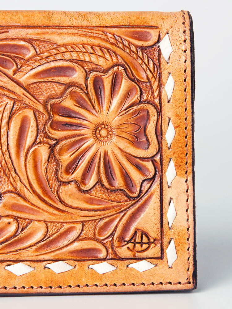 Crafted for those who embrace authentic Western craftsmanship, this beautifully hand-tooled leather wallet features bold floral carving and intricate scrollwork. The natural tan finish highlights the deep tooling details, bordered with elegant white lace-stitch accents for a truly classic cowboy aesthetic.