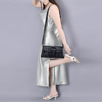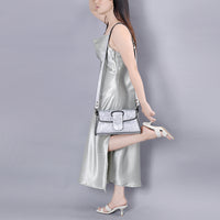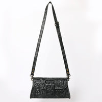 - Design: Unique cutout handle for clutch wear and a tooled detachable shoulder strap.