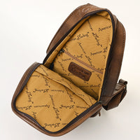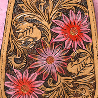 - Front pocket showcases hand-tooled floral carving with painted accents.