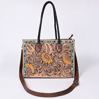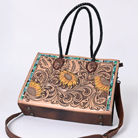 Carry a piece of wearable art with this stunning tote from American Darling. This bag features a generous panel of rich genuine leather, completely covered in intricate, deep hand-tooled floral carving. The design is brought to life with bold painted accents, highlighting the beautiful sunflowers and contrasted by geometric elements, capturing the vibrant spirit of the Southwest. The structured silhouette is anchored by sturdy top handles and a versatile, removable crossbody strap.