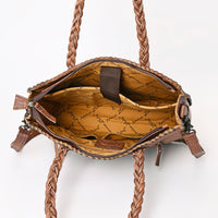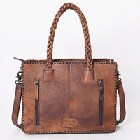 Carry wearable art to the office or the ranch with this magnificent tote bag from American Darling. Handcrafted from premium, full-grain genuine leather, the front panel features deep, intricate floral hand-tooling that showcases superior artisan skill. The design is framed by the rich, distressed leather of the back panel and edges, while the sturdy top handles are beautifully hand-braided, ensuring both durability and luxurious style.