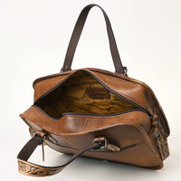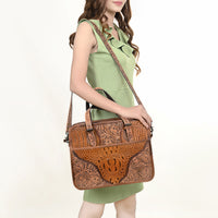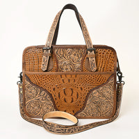 Elevate your professional style with this stunning, artisan briefcase tote from American Darling. The front panel is a masterpiece of texture, combining distressed genuine leather, hand-tooled floral carving, and a bold inset of exotic crocodile embossed leather. This stunning mixed media construction is framed by a sturdy silhouette and features comfortable top handles and a versatile, detachable crossbody strap.