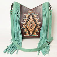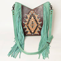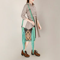 ADBG1199 Mint Fringe Leather Crossbody Bag - Tooled Aztec Design with Gemstone Accents