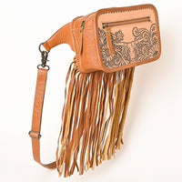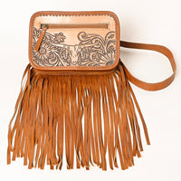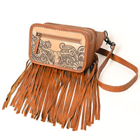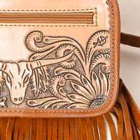 ADBG1247 Western Hand Tooled Genuine Leather Longhorn Fringe Floral Crossbody Bag
