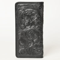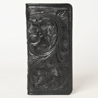 Embrace timeless elegance with this luxurious long wallet from American Darling. Handcrafted from rich, genuine leather, the exterior is completely covered in deep, traditional floral and scroll hand-tooling, giving the wallet a stunning, textured finish. The vertical, bifold structure is designed for a slim profile, making it comfortable to carry in hand or slip into a larger bag.