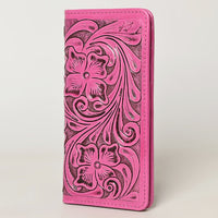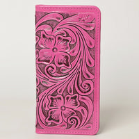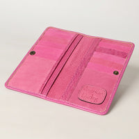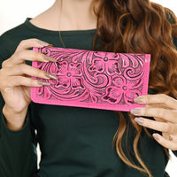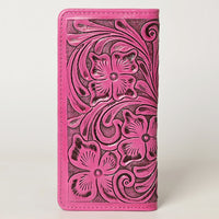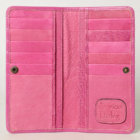 Make a bold statement with this luxurious long wallet from American Darling. Handcrafted from rich, genuine leather, the exterior is completely covered in deep, traditional floral hand-tooling with a vibrant pink finish that accentuates the carving detail. The vertical, bifold structure is designed for a slim profile, making it comfortable to carry in hand or slip into a larger bag.