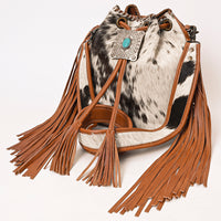 ADBG1272 Hair-On Hide Leather Fringe Bucket Bag with Turquoise Concho Accent