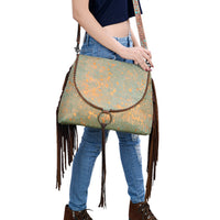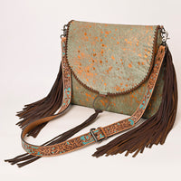 Make a luminous statement with this luxurious, handcrafted saddlebag from American Darling. The front features a unique hair-on cowhide with a splatter effect over a sage/teal base, creating a stunning, high-luxe texture. The design is framed by rich distressed genuine leather, which forms the long side fringe and the adjustable strap, which is accented with beautiful floral tooling and a stone.