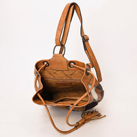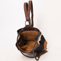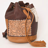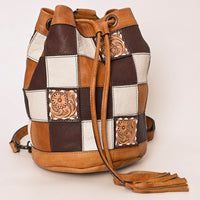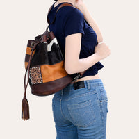 ADBG1324 Western Patchwork Leather & Cowhide Drawstring Backpack with Tooled Accent