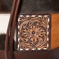 Saddle up with rustic charm and modern flair in this handcrafted drawstring backpack. Designed with a patchwork of genuine leather and hair-on cowhide, it features a stunning floral-tooled leather panel on the front. The spacious interior and leather straps make it both fashionable and functional for life on the go.