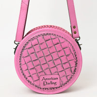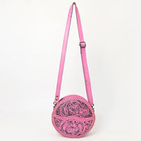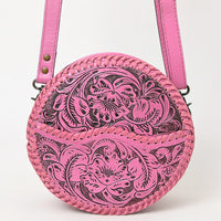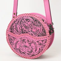 ADBG1461 Pink Round Natural Hand-Tooled Leather Canteen Bag - Floral Whipstitch Western Style