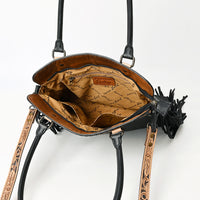Bring elevated Western style to your wardrobe with this stunning black leather tote bag, designed with a natural tooled yoke and dramatic side fringe. The structured silhouette is crafted from smooth full-grain leather and features hand-tooled floral detailing across the top yoke, paired with a matching tooled detachable shoulder strap for crossbody wear.