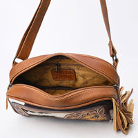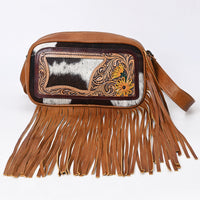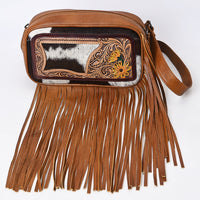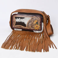 ADBG1524 Hand Tooled Leather & Cowhide Crossbody Fringe Bag - Western Floral with Yellow Daisies