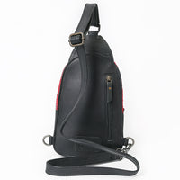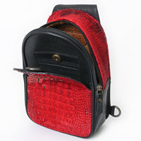 The bold red hair-on leather is complemented by a deeply embossed gator pattern and sleek black leather trim. Designed for hands-free movement whether you're exploring the open road, the rodeo grounds, or a weekend market.
