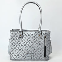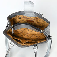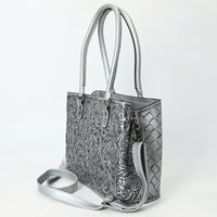Elevate your Western fashion with this eye-catching silver hand-tooled leather tote bag – a perfect harmony of luxury and heritage. With its radiant silver finish and detailed floral tooling, this tote adds a bold shine to any outfit while celebrating timeless craftsmanship.
