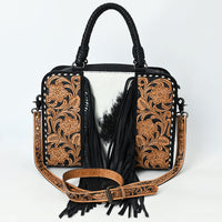 Bring bold Western beauty into your wardrobe with this hand-tooled leather handbag featuring black and white hair-on cowhide, dramatic black leather fringe, and rich floral tooling on both sides. A true statement piece for the modern cowgirl.